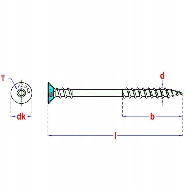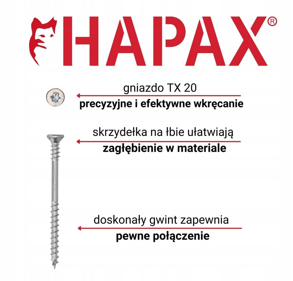 - Potrójny gwint Hapax – zmniejsza ryzyko rozłupywania drewna, niweluje odstępy między krawędziami i płytami, co zapewnia precyzyjny montaż mebli.